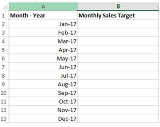 You are creating a spread sheet to set a monthly sales target for your team.You want to fill in the first column of the sheet with Month and Year as shown.Which of the following will help you drag the fill handle in MSExcel 2010 toautomatically fill the rest of the months after you type the first month Jan-2017 manually?